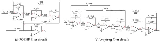 In order to verify the effectiveness of the method proposed in this paper, two standard circuits commonly used in the field of fault diagnosis are selected as the experimental objects to carry out measurement node selection experiments and fault diagnosis experiments. The schematic diagrams of the four-opamp biquad high-pass (FOBHP) filter circuit and leapfrog filter circuit are shown in Figure 7a,b, and the red numbers represent the measurement nodes of the circuits.