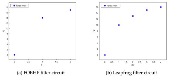As can be seen from Figure 8, within a certain limit, the greater the number of measurement nodes, the greater the number of fault types that may be included in the collected data; however, the number of measurement nodes is not the more the better, and, in practical applications, need to be combined with the specific circumstances for the selection of the set of measurement nodes. Take the leapfrog filter circuit as an example, when the number of measurement nodes is 1, the number of faults involved in the sampling data set is 10; when the number of measurement nodes is 4, the number of faults involved in the sampling data set is 16. However, when the number of measurement nodes is increased from 3 to 4, the number of faults only increases by 1. Therefore, the number of measurement nodes needs to be selected reasonably if the test cost of multiple measurement nodes is considered in the actual situation. At the same time, there is no solution in the Pareto front of the leapfrog filter circuit with the number of measurement nodes greater than 4, which indicates that the number of fault types does not increase when the number of measurement nodes continues to increase, which also proves that the measurement node selection method proposed in this paper is able to guarantee the maximum number of fault types when the number of measurement nodes is as small as possible. The optimal set of measurement nodes for the two standard circuits is shown in Table 4.