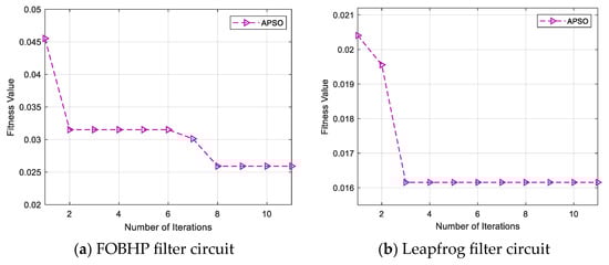 In this section, soft-fault diagnosis experiments are conducted on two standard circuits, and the iterative optimization search process of the APSO algorithm in the fault diagnosis model is shown in Figure 9, which shows that the fitness values (classification prediction failure rate) of standard circuits are significantly reduced within the number of iterations, which indicates that the APSO parameter optimization module is able to effectively improve the fault diagnosis capability of the SDAE model.