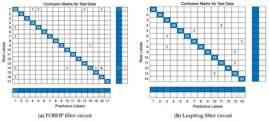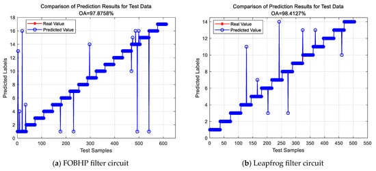 The classification results of the two standard circuits performing the soft-fault diagnosis task are shown in Figure 10. From the overall analysis, the accuracy rates obtained by the APSO-SDAE model on the FOBHP filter circuit and the leapfrog filter circuit reach 97.88% and 98.41%, respectively, indicating that the APSO-SDAE model is able to accurately identify most of the soft-fault types of the FOBHP filter circuit and the leapfrog filter circuit, which exhibits a relatively excellent fault diagnosis performance.