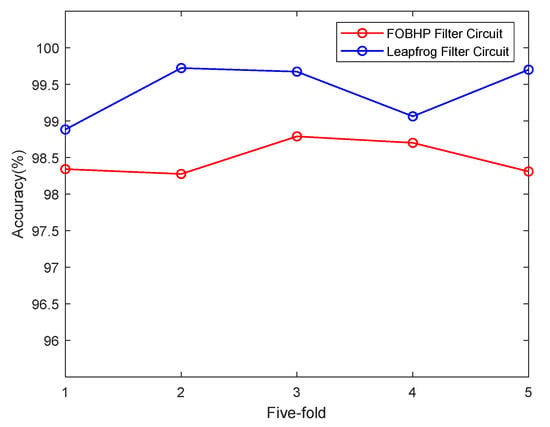 In order to reduce the influence of chance factors, 5-fold cross-validation experiments are conducted on the APSO-SDAE fault diagnostic model to evaluate the performance and generalization ability of the model. The results of the 5-fold cross-validation for the FOBHP filter circuit and leapfrog filter circuit are shown in Figure 12. It can be seen that the generalization ability of the APSO-SDAE fault diagnosis model is strong, and the model has a stable effect on the diagnosis of soft faults in analog circuits.