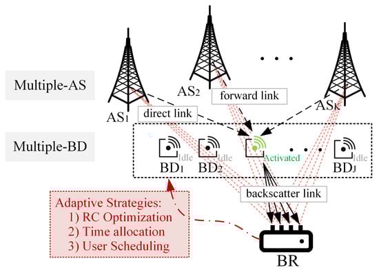 However, the existing AmBC systems [,,,,,,] cannot efficiently allocate scarce energy and spectrum resources to the incoming massive IoT because these systems mainly focus on end-to-end non-adaptive backscatter communication with a single AS and one or more BDs, where the more common multi-AS and multi-BD AmBC system in massive IoT network has been rarely studied. The existing AmBC systems are generally unreliable and inefficient because of the crowded backscattering environment in massive IoT scenarios. The outage often occurs because of a lack of sufficient RF-EH supply, and the sum rate is limited due to the spectrum scarceness under massive direct-link interferences (DLIs) and inter-BD interferences. To reduce outage probability and boost the sum rate performance of AmBC in massive IoT, adaptive AmBC techniques for the multi-AS and multi-BD system are supposed to undergo further research.