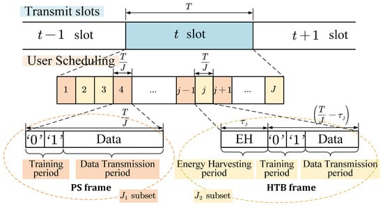 Transmit frame structures of the proposed adaptive AmBC: In transmit slot t, which maintains a total time length T, the proposed adaptive strategy exploits user scheduling to divide the J BDs into subset (using PS frame) and subset (using HTB frame). In the PS and HTB frame, the training period is utilzed to estimate the channel parameters as most AmBC systems [,,,,].