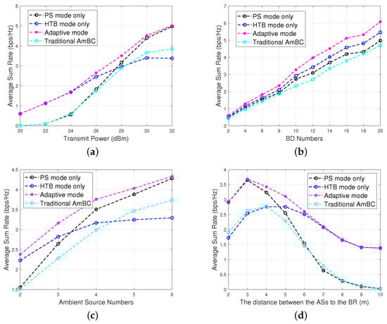 Average sum rate performances vs. (a) transmit power, (b) BD numbers, (c) ambient source numbers, and (d) the distance between the ASs and the BR.