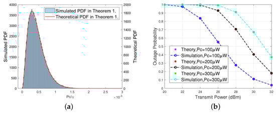 In Figure 4, the numerical and simulation results of are illustrated. (a) shows the simulated PDF and the theoretical PDF in Theorem 1. (b) compares the simulated outage probabilities and our derived in (38) with K = 3, J = 10, 30 dBm transmit power, and μW, 200 μW, 300 μW. The results confirm the accuracy and tightness of our derivation of .