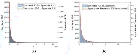 Numerical and simulation results of . (a) shows the simulated and theoretical PDF comparison of Appendix B.1. (b) shows the simulated and approximate theoretical PDF comparison of Appendix C.