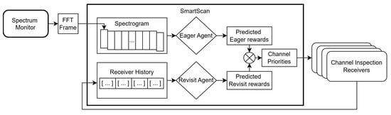 SmartScan is a novel scanning framework designed to efficiently balance the discovery of new information with the updating of existing knowledge. It achieves this by orchestrating two specialized agents, an Eager Agent and a Revisit Agent, working in tandem. The Eager Agent rapidly explores and processes newly active channels as soon as energy appears in the spectrum by observing a live spectrogram composed of fast-Fourier-transform (FFT) frames generated by the spectrum monitor, ensuring minimal delay in initial analysis of signals. In parallel, the Revisit Agent periodically re-examines previously explored channels based on the time since last visit, thereby keeping the accumulated knowledge up to date. Together, these components enable SmartScan to maintain a dynamic equilibrium between exploration and exploitation of data sources. This division of labor addresses the common trade-off in continuous scanning systems: the Eager Agent prevents missing out on new signals, while the Revisit Agent ensures a nearly constant sweep interval across all channels.