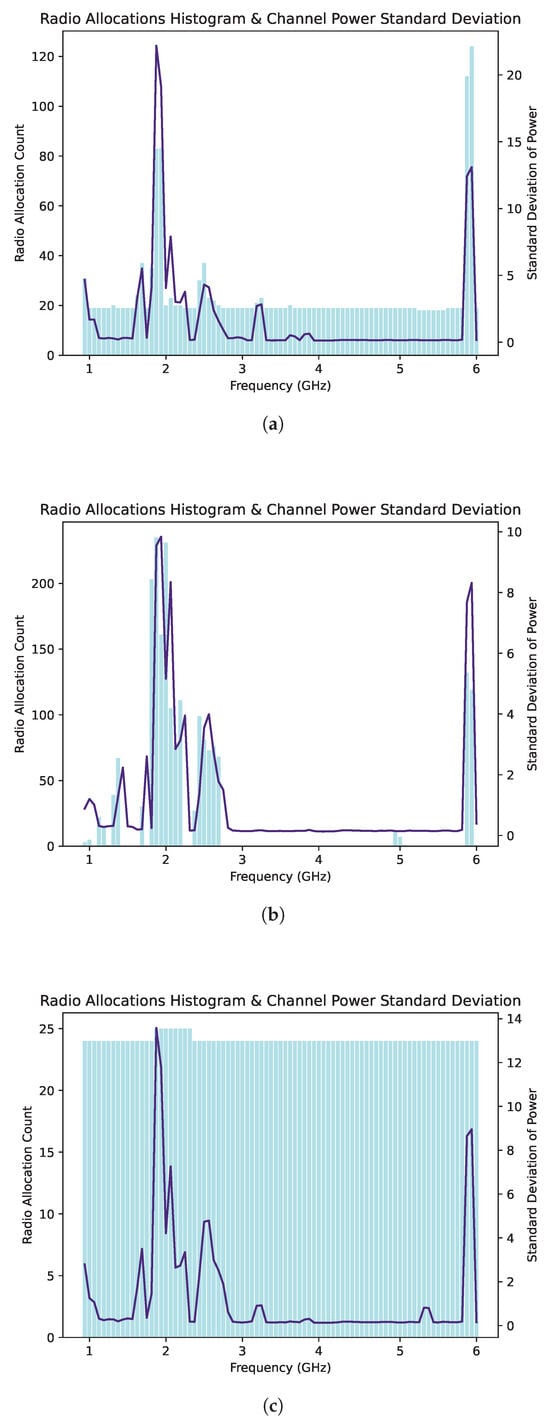 Figure 6 illustrates the efficacy of the SmartScan framework by contrasting the allocation behaviors of the individual agents with that of the combined MoE approach. Panel (a) demonstrates that the MoE integration strategically concentrates Channel Inspection Receivers on frequency bands exhibiting higher standard deviations in channel power, thereby targeting regions of elevated spectral activity. In contrast, panel (b) illustrates that the Eager Agent, when deployed independently, overcompensates by concentrating resources solely on active bands, resulting in several GHz-wide segments of the spectrum where comparatively low-peak-power signals would go undetected. Panel (c) shows that the Revisit Agent, operating in isolation, uniformly distributes actions across the spectrum without adequately prioritizing more active channels, taking the naïve approach. These observations confirm that the SmartScan framework, through its integrated MoE strategy, robustly balances the need for dynamic responsiveness with consistent coverage, thereby enhancing the reliable detection of both LPI and LPD signals under hardware constraints.