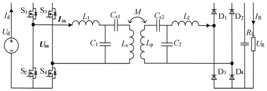 Inductive power transfer (IPT) technology is capable of transmitting energy through the high-frequency magnetic field without physical contact. This indicates that IPT technology, adopted in a variety of applications, such as implantable medical devices and electric vehicles, is promising, due to its advantages of weather proofing, higher convenience, and low maintenance [1,2,3]. The IPT system generally requires separate compensation circuits at the transmitter and receiver, respectively, to compensate for the leakage inductance and achieve the high-performance operation of the system. Figure 1 shows the DS-LCC compensation topology, in which there is an LCC circuit on both the transmitter and receiver. L1, C1, and Cs1 make up compensation elements of the transmitter. L2, C2, and Cs2 make up compensation elements of the receiver. Ls and Lp are the self-inductances of the transmitting coil and receiving coil. M depicts the mutual inductance. Switching devices S1–S4 compose the inverter at the transmitting side, while diodes D1–D4 compose the rectifier at the receiving side. Compared to lower order compensation networks such as SS compensation topology, this compensation topology offers greater design flexibility, multiple resonant points, a stable resonant frequency independent of the mutual inductance, and enhanced tolerance to the misalignment [4,5,6]. Its ability to maintain the load-independent constant output at the resonant frequency simplifies the control system design, making it a preferred choice in recent research [7,8]. However, due to a number of factors, such as the variation in the internal heat and ambient temperature, aging effect, and industrial error, the parameter of elements can deviate from their ideal values with the ±10% fluctuation [9]. The parametric deviation can cause the system to be detuned and further leads to the loss of the load-independent constant output characteristic. Therefore, for the DS-LCC compensation topology, it is of great significance that under the parametric deviation, the load-independent constant output characteristics can be implemented.