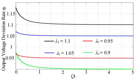 To still maintain the load-independent constant output characteristics of the L-circuit, from (21), the output voltage deviation rate ηL = |Uc1(λ1≠1)|/|Uc1(λ1 = 1)| as the function of QL can be shown in Figure 7 under different λ1. As illustrated in Figure 7, the deviation rate ηL remains essentially constant over the larger range of QL. Consequently, QL should be designed to be as large as possible during the load RL range.