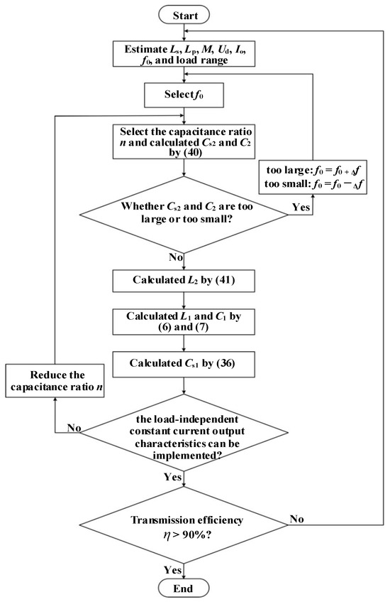 On the basis of the above analysis, it can be concluded that under the parametric deviation of components, the load-independent constant current output of the DS-LCC compensation topology can be implemented by reducing the capacitance ratio n, and the constant transmission gain can be achieved by the FM control. However, the reduction in the capacitance ratio n not only leads to a decrease in the transmission efficiency in resonance but also causes compensation capacitances Cs2 and C2 to become excessively large or small. In addition, the parasitic resistance of the compensating element is ignored in all of the above analysis, which may also affect the implementation of the load-independent constant current output. As a result, for the purpose of implementing the load-independent constant current and constant transmission gain under the parametric deviation, the proposed design approach is illustrated in Figure 8 and as follows: