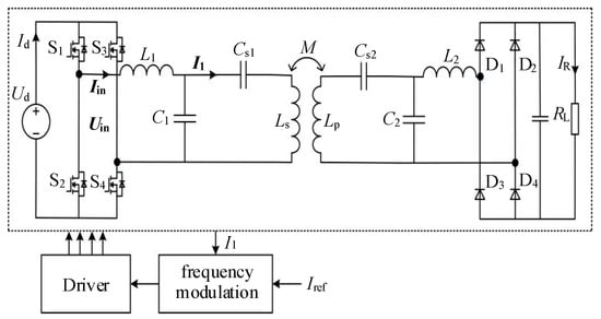 When the design of the compensation network is completed, the proposed IPT system still requires the FM to achieve the constant current output. Consequently, the schematic diagram of the DS-LCC compensation IPT converter can be represented as in Figure 9. As can be gathered from Figure 9, the output current I1 of the L-circuit is detected and conveyed to the FM controller. Then, switching signals can be generated by comparing I1 with Iref. This demonstrates that the suggested methodology is able to eliminate the communication module between the transmitter and receiver.