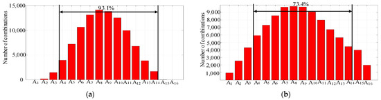 Distribution of combinations at different ranges of output current deviations under different capacitance ratios n. (a) n = 0.15; (b) n = 1.