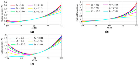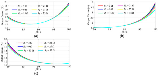 The output current, as the function of the operating frequency under different parametric deviation combinations, is represented in Figure 11 and Figure 12, when n = 0.15 and n = 1. From Figure 11a and Figure 12a, without the parametric deviation, the FM range for implementing the load-independent constant current output characteristics is 85 kHz to 95 kHz for n = 0.15, while the FM range is only 88 to 92 kHz for n = 1. Likewise, it can be observed from the comparison of Figure 11b and Figure 12b that when the parametric deviation is Case 1, the FM range with the load-independent constant output is 80 kHz to 92 kHz for n = 0.15, and the FM range is 85 kHz to 90 kHz for n = 1. From Figure 11c and Figure 12c, when the parametric deviation is Case 2, the FM range for n = 0.15 is also wider than that for n = 1. Therefore, through the reduction in the capacitance ratio n, the load-independent constant output characteristics can be maintained under the parametric deviation and FM.