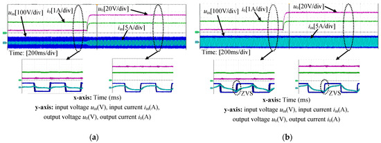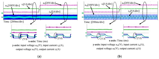 Figure 18 shows the experimental waveforms of load switching under different capacitance ratios when the parametric deviation is Case 2. Based on Figure 18a, under n = 1, when the load is changed from 3 Ω to 33 Ω, the output current varies from 1.47 A to 1.61 A at the constant operating frequency, the fluctuation of the output current is +7.3%. From Figure 18b, under n = 0.15, the output current can also be maintained at approximately 1.5 A within 40 ms, and the fluctuation is less than 5%. Likewise, from Figure 18, when the parametric deviation is Case 2, the load-independent constant current characteristic can also be realized under n = 0.15. In addition, at n = 0.15, ZVS can also be implemented over the load range.