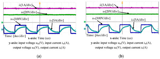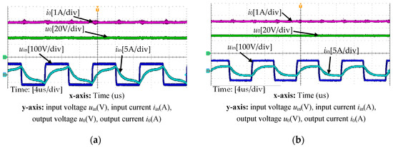 Figure 15 illustrates experimental waveforms of input current iin, input voltage uin, load current iR, and load voltage uR under different capacitance ratio when the parametric deviation is Case 1 and RL = 33 Ω. It can be observed from Figure 15a that when n = 1, the output current can be sustained at 1.5 A by adjusting the operating frequency from 90 kHz to 80 kHz. According to Figure 15b, when n = 0.15, the operating frequency only needs to be regulated from 90 kHz to 85 kHz to maintain the output current at 1.5 A. Due to the increase in the reactive power caused by the FM, the efficiency at n = 1 and n = 0.15 drops to 73.9% and 87.4%. A comparison of Figure 15a,b shows that the higher efficiency can be obtained at n = 0.15, since the FM range is smaller.