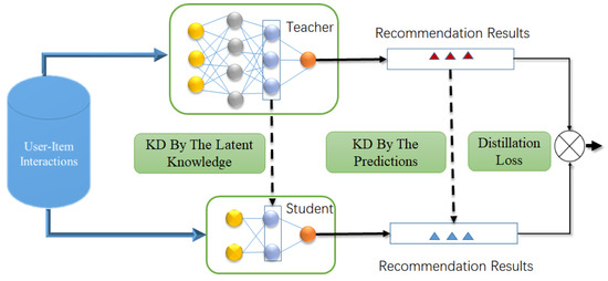 For example, Tang et al. [50] propose a ranking distillation (RD), which applies pairwise distillation to minimize two loss functions: the ranking loss relative to the ground truth ranking in the training dataset, that is, collaborative filtering loss, and the distillation loss of the top k ranking for unlabeled items, which is used to bootstrap Student. Unlike RD, Lee et al. [51,52] propose a new collaborative filtering method, namely collaborative distillation (CD), and apply a point-wise distillation approach to minimize two loss functions: collaborative filtering loss function, which can provide more accurate feedback and avoid the ambiguity of unknown feedback, and the sampling-based knowledge distillation loss function, which can not only distinguish between positive/negative and missing feedback, but also capture users’ relative preferences for different items. Both methods use a negative log-likelihood cross-entropy loss function.