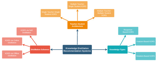 In knowledge distillation, knowledge types, distillation schemes, and Teacher–Student architectures all play a essential role in Student learning. In this section, knowledge distillation recommendation methods are summarized and classified, respectively, from the perspectives of knowledge types, distillation schemes, and Teacher–Student architecture, as shown in Figure 2.