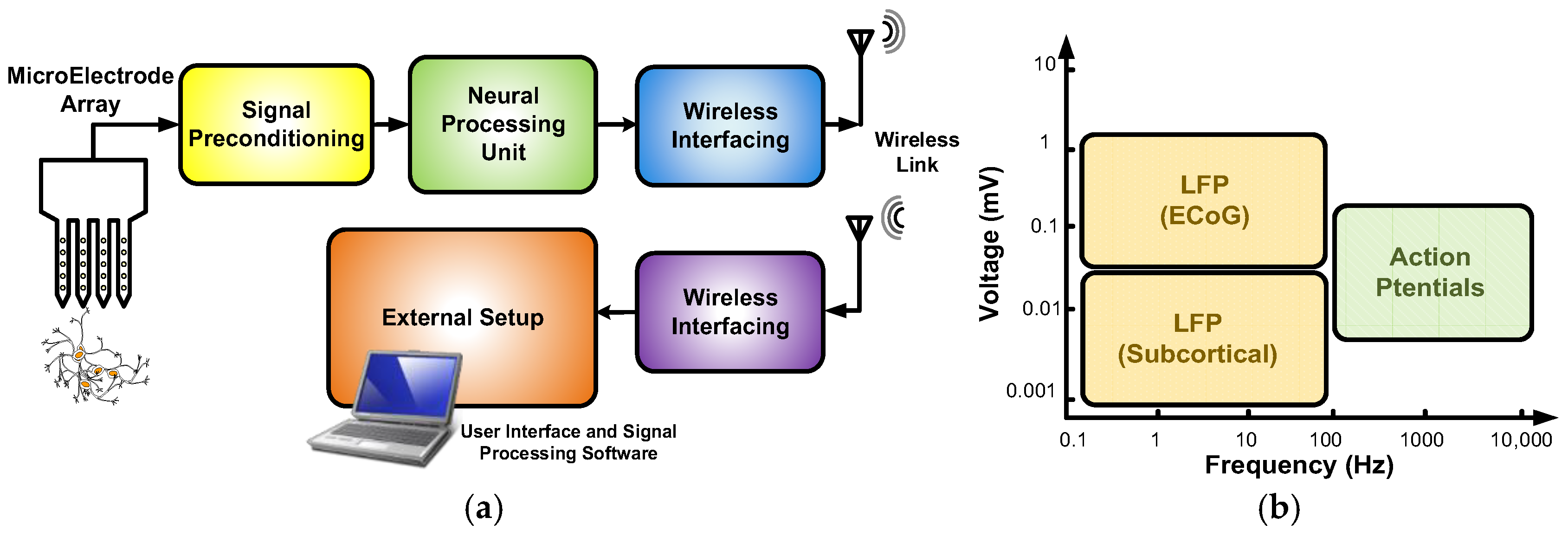 9]. These signals include action potentials (APs), indicating the firing of individual neurons, and local field potentials (LFPs), representing grouped neuronal activity. Effective analysis often requires separating LFPs (0.1 Hz to 100 Hz) from APs (100 Hz to below 10 kHz) through preamplification and linear filtering [
