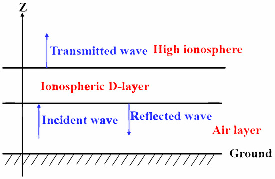 Near the ground, the ionosphere is weakly ionized, and the electron density and collision frequency between electrons and neutral ions can be calculated by analytical formulas [20,21]. The physical model of electromagnetic-wave propagation in the ionosphere is shown in Figure 1. However, when the height increases, the degree of ionization increases, the electron density and collision frequency of the ionosphere no longer change regularly, and the ionosphere parameters cannot be expressed by formulas [22,23,24]. The description of ionospheric properties involves many parameters, such as electron density and electron collision frequency. In the low ionospheric exponential model established in this paper, the electron density and collision frequency, which have a great influence on the electromagnetic-wave propagation in the ionosphere, are mainly considered. The electron density and collision frequency of the exponential ionospheric parameter model widely used in the low ionosphere are shown in Equation (1) and Equation (2), respectively.