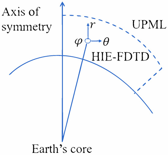 In the formula, is the magnetic-field intensity () ; is the electric-field intensity (); is the current density (); is the dielectric constant in vacuum (); and is the magnetic permeability in vacuum (). In the spherical coordinate system, the electric-field vector and the magnetic-field vector can both be split into scalars in three directions, corresponding to the radial direction r perpendicular to the ground, the electromagnetic-wave propagation direction along the ground, and the direction perpendicular to the wave vector direction, respectively. The expansion in the spherical coordinate system is as follows,