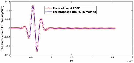 It can be seen from Figure 4 that the two results agree well with each other. The Gaussian pulse sources have limited duration and smooth waveforms, with a rapid increase in amplitude at the beginning and a rapid decrease to zero after reaching a peak. The simulation results are highly consistent with this theory, which indicates that the proposed method has excellent calculation accuracy. The simulation takes 27.1 min for the traditional FDTD method and 98.6 min for the proposed method.
