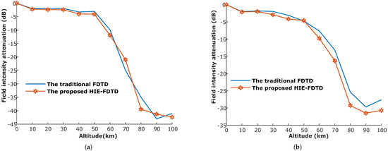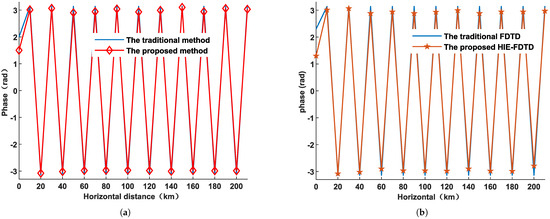 Meanwhile, Figure 6a,b provide the comparison of daytime data and the nighttime of the phase between the algorithm proposed in this paper and the traditional algorithm. Although the attenuation trends of VLF waves are approximately the same during the day and at night, the attenuation during the day is significantly greater than that at night. The maximum difference in phase between the algorithm proposed in this paper and the traditional FDTD algorithm is 9° during the day and 13° at night. The composition of the ionosphere changes the most at night, mainly because the sun sets. Without the source of electrical radiation, the ionosphere at D and E levels (as shown in the above figure) stops ionizing, but the F region (especially F2) remains completely ionized.