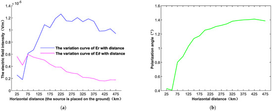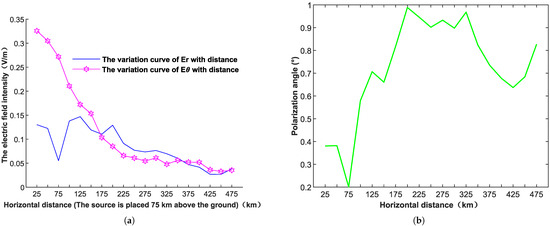 Example 2: Horizontal dipole source. The source adopts a time-harmonic field and is placed 75 km away from the ground. Observation points are set in sequence at a height of 75 km from the ground. The horizontal distance from the source is 5–475 km. The curves of and varying with the distance are obtained through simulation, as shown in Figure 8a. The polarization characteristics under this kind of calculation example are analyzed, and the variation curve of the polarization angle with distance is obtained through simulation, as shown in Figure 8b.