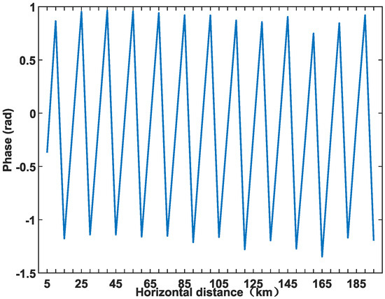 During the propagation of VLF electromagnetic waves, the variation of ionospheric electron density in the horizontal direction is relatively small, so the phase is also less affected by the ionosphere. The phase will be nonlinearly changed due to the influence of the ionosphere. When the frequency is 20 kHz in the horizontal direction during the propagation process, observation points are set every 5 km within the range of 1–200 km in the horizontal direction at the corresponding heights to record the data of the electromagnetic field with respect to time. Then, the phase at each position is obtained by using the phase-lag method, so that the phase-change curve of the field quantity Er in the horizontal direction can be drawn as shown in Figure 9. In fact, when the distance is not far, the horizontal variation of the ionosphere is relatively small, which means that the phase of electromagnetic waves propagating in the horizontal direction will not be affected. The phase-change characteristics of electromagnetic waves in the horizontal direction can also serve as a reference for comparison with other situations.