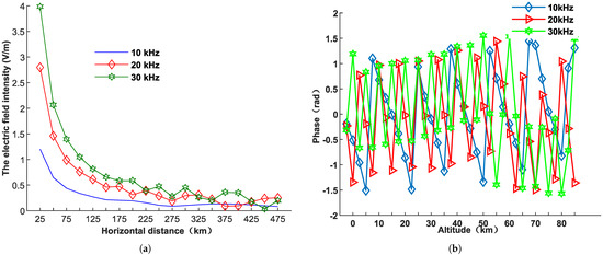 VLF electromagnetic waves with frequencies of 10 kHz, 20 kHz, and 30 kHz were adopted to study the influence of sinusoidal electromagnetic waves of different frequencies on the amplitude and phase, as shown in Figure 10a,b.