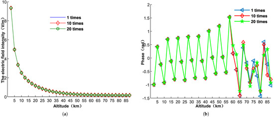 The electron density was amplified by 20 times and 10 times, respectively, and compared with the standard parameters to study the influence on the amplitude and phase of the electromagnetic wave when the electron density was amplified. The amplitude and phase-variation curves are shown in Figure 11a,b. Figure 11a shows the variation curves of the Er amplitude value with the vertical distance when the vertical dipole source is placed on the ground under different electron densities, and Figure 11b gives the variation curves of the phase of Er of the vertical dipole source placed on the ground under different electron densities with the vertical height distance. For the electron density, it gradually increases with the increase in height, which will cause the phase of the electromagnetic wave to be abnormal at the same time; that is to say, the greater the electron density, the greater the impact. When it reaches a certain extent, it will cause the phase of the electromagnetic wave to be inconsistent. However, the simulation found that in the low ionosphere region, with the increase in the electron density, the amplitude value of the electric-field intensity basically does not change. This may be due to the small thickness of the ionosphere used in the simulation. Currently, the IRI international reference ionosphere is being studied to verify the correctness of this phenomenon.