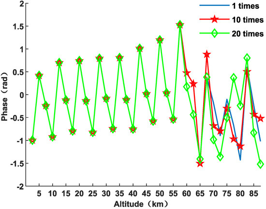 When the collision frequency is amplified, as the amplification factor increases, the abnormal situation of the phase becomes more obvious. The phase becomes different from 60 km above the ground. When the collision frequency is amplified by 20 times, the height at which abnormalities occur increases accordingly, and abnormalities occur at 73 km.