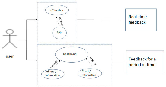 Following the aforementioned responses, the requirements for the proposed system were ascertained, and a use-case diagram of the proposed project was established (Figure 1). The athlete is measured by the IoT toolbox consisting of the essential sensors. These measurements are displayed in real-time by a mobile application and during a time period by a web dashboard. The system is described in more detail in the following sections.