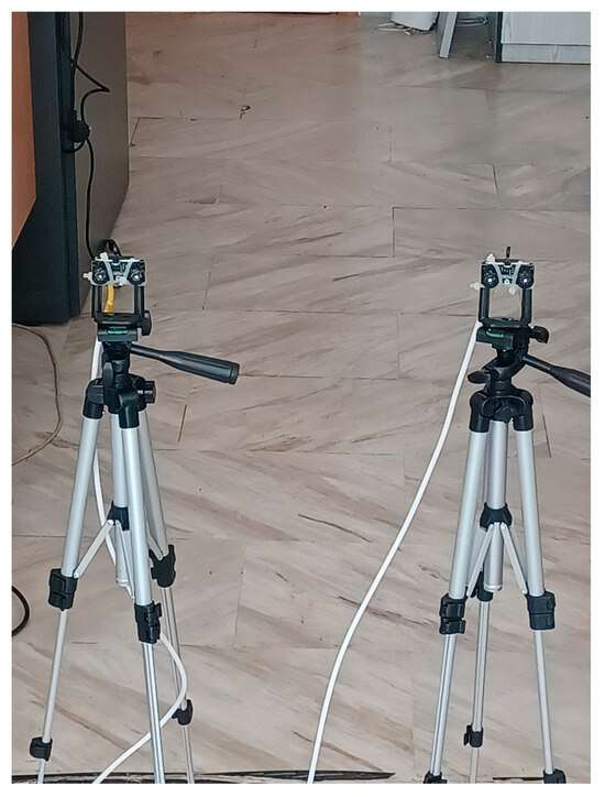 Each sensor is placed on a tripod, whose height is foldable, to be adaptive to every athlete’s height. The two tripods are placed next to each other in a fixed predefined distance according to the width of the lane where the athlete is moving (Figure 4). At the beginning of the bowling alley, there is the first set of in-line dots. One tripod is placed on the same line as the second dot from the left end, and the other tripod is placed on the same line as the second dot from the right end.