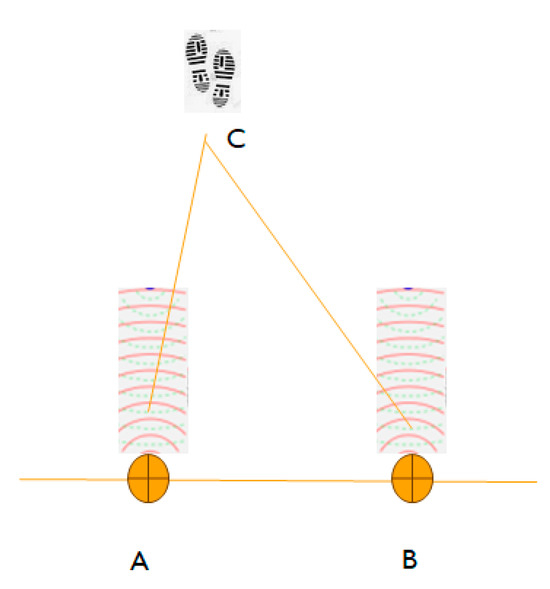 During the bowling training, the system of the two ultrasonic sensors is placed behind the bowling lane, and the sensors look forward and are set to the hip height of the athlete. When the athlete begins his/her approach, for every step, the Arduino microprocessor calculates the step number, duration, direction and projections of every step distance from the left and right sensors. In addition, for all steps, the total number of steps and total duration are measured. More specifically, the direction of every step is calculated from the two ultrasonic sensors placed at a distance between them and forming a virtual triangle with the athlete’s step [17]. Thus, considering every step as arc (C), one sensor as arc (A) and the other sensor as arc (B), if the distance from sensor B is greater than that from sensor A (i.e., BC > AC), then the bowler steps to the left and vice versa (Figure 7).