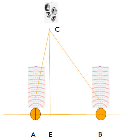 In our case (Figure 8), applying the aforementioned formulae, the sides of the virtual triangle are known, since the AB is fixed, and the AC and BC are calculated by the sensors. Thus, the area of the virtual triangle is calculated as AR = √ S × (S − AC) × (S − BC) × (S − AB). Then, utilizing the known value of the triangle area AR and the fixed AB triangle side, the height CE, which is the actual distance from the athlete’s step, is calculated using the formula CE = (2 × AR)/AB.