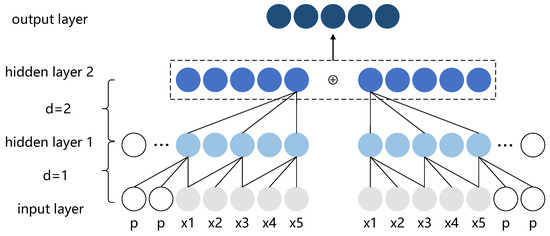 Architectural elements in a BiTCN. A dilated causal convolution with dilation rate d = 1, 2, and convolution kernel size k = 3; p stands for padding, x represents an element in the input sequence.