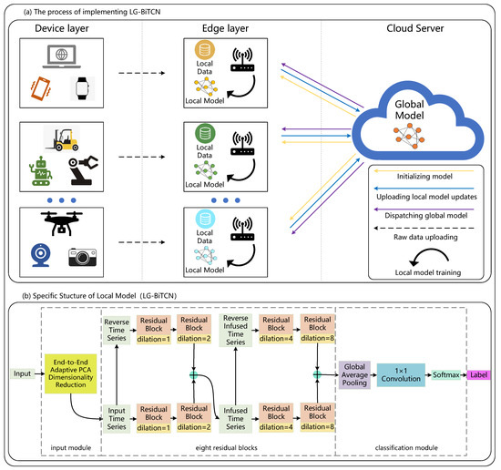 The proposed LG-BiTCN IoT malicious traffic detection network operates in five key stages as illustrated in Figure 2. In the first stage, the cloud server issues an initialized global model to the edge layer. Secondly, the edge layer will collect raw traffic time-series data from the device layer for local training. After completing local training, the model updates from the edge layer are transmitted to the cloud server for integration into a global model. Finally, the global model will be dispatched to the edge layer. This process is repeated for several rounds, until the final global model is deployed on the edge devices for malicious traffic detection.