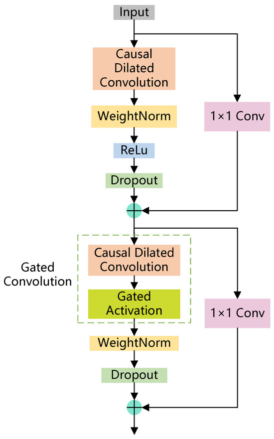 The specific structure of the LG-BiTCN’s residual block is illustrated in Figure 3. After entering the residual block, the input time series will firstly undergo parallel processing through two distinct pathways: the primary branch and a residual connection. In the primary branch, causal dilated convolution is employed to efficiently capture extended temporal dependencies from input time series, after which the output time series is then subjected to standard optimization procedures, including weight normalization, ReLU activation, and dropout. Concurrently, the residual branch applies 1 × 1 convolution to ensure dimensional compatibility with the primary branch’s output channels. The final output is obtained by concatenating the time series from both branches. This combined output then undergoes a similar process, with the notable distinction that the conventional causal dilated convolution is replaced by a gated convolution mechanism inspired by the LSTM architecture. This strategic architectural enhancement supersedes the conventional causal dilated convolution in the residual blocks, enabling them to dynamically discriminate and preserve the most informative long-term dependencies from the expanded temporal receptive field achieved through the causal dilated convolution.