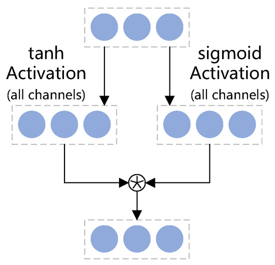 Gating mechanisms play a crucial role in controlling the flow of information through neural networks and have proven to be indispensable in recurrent architectures [42]. In LSTM, the input gate and forget gate mechanisms enable unimpeded information flow across multiple time steps, effectively addressing the vanishing gradient problem caused by information loss. The output gate mechanism controls which long-term dependencies will be propagated to the subsequent layers in the network hierarchy. Considering that convolutional networks possess inherent resistance to the same vanishing gradient problem as LSTM does [43], we carefully introduce the structure of the output gate into the residual blocks, which allows the network to selectively control the presence of long-term dependencies through its hierarchical layers. As shown in Figure 1, gated convolution integrates causal dilated convolution with gated activation mechanisms to form a coordinated architecture. While causal dilated convolution has been introduced in Section 3, the mathematical formulation of gated activation shown in Figure 4 is defined as follows: