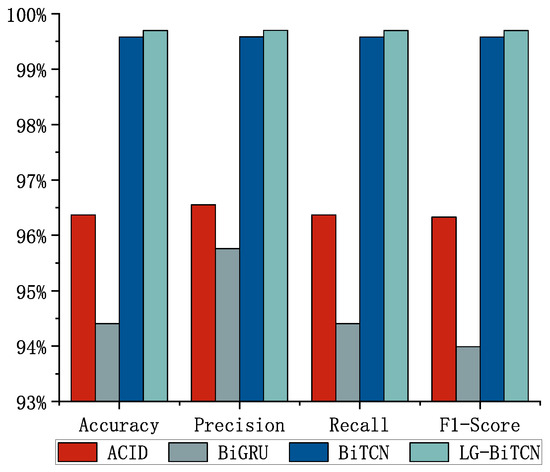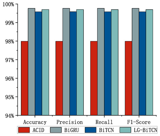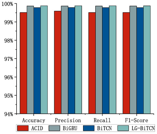We compared the LG-BiTCN with the other four models on three datasets; Figure 5, Figure 6 and Figure 7 shows the average detection results of 10 experiments, and Table 3 demonstrates the comparison of the computational overhead of different models. In the 14 classes of tasks on the Edge-IIoT dataset and the 10 classes of tasks on the ToN-IoT, the LG-BiTCN outperforms the other compared models in terms of accuracy, precision, recall, and F1-measure by 99.69% and 99.88%; moreover, it exhibits significantly lower model complexity than the other models.