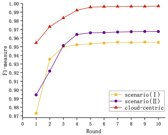 The models obtained through both scenarios were tested on a test set containing the complete set of types; a comparison of the models based on different experimental scenarios is shown in Figure 8. It is clear that the LG-BiTCN has excellent detection results as well as fast convergence speed in the process of aggregating into the final global model. In scenario (i), although both the anomaly detection performance of the global model in a Federated Learning setting and the convergence speed are affected, the LG-BiTCN model still achieves a classification accuracy of 96.75% after just six rounds of cloud–edge training. Furthermore, starting from the fourth round, the F1-measure is only 3% lower than that observed in the cloud-centric scenario. In scenario (ii), although the model’s final F1-measure and convergence speed were not as good as the other two scenarios, it still reached and stabilized above 95.22% after only four rounds of training, and, considering its ability to share attack intelligence among edge devices to avoid unknown attacks, we conclude that this marginal performance trade-off is acceptable within the context of distributed threat detection. Therefore, the proposed LG-BiTCN demonstrates its viability as a Federated-Learning-based intrusion detection solution for IoT environments. Through federated training, the LG-BiTCN empowers edge devices with enhanced capabilities in detecting previously unseen attack patterns, thereby improving the overall security posture of distributed IoT systems.