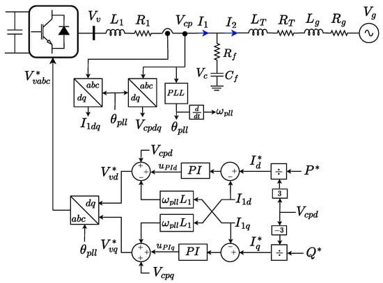 The PLL aligns the d-axis of the SRF with the PCC voltage, so . The grid voltages can be written as (see Figure 4)