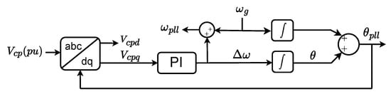 The angle of the PCC voltage () is obtained by means of a PLL based on the synchronous reference frame, shown in Figure 2. It determines the grid angle by controlling the q-axis voltage to zero (). Thus, the PCC voltage is aligned with the d-axis of the SRF. The closed-loop transfer function of the PLL is