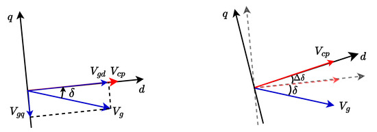 where , and is the angular speed of the dq frame. Note that the last terms of Equation (9) refer to the d- and q-axis PCC voltages, respectively: