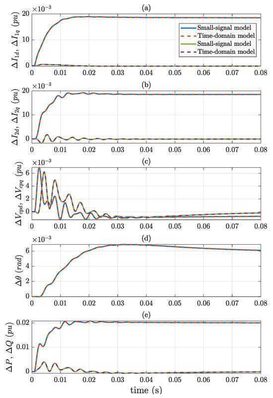 Figure 5a,b show the d- and q-axis components of the output VSC and grid currents, respectively ( and in Figure 1). It can be seen that the d-axis current increases while the q-axis current remains unchanged since the d-axis of the synchronous reference frame is aligned with the PCC voltage. Figure 5c displays the d- and q-axis components of the PCC voltage. The q-axis component returns to zero due to the PLL control while the d-axis component is negative, meaning that the voltage at the PPC decreases due to a higher voltage drop caused by a higher current. The angle increase measured by the PLL is shown in Figure 5d. Finally, the active and reactive powers are depicted in Figure 5e. It can be noted that the results obtained from both models are superimposed during the whole transient, thereby validating the small-signal model.