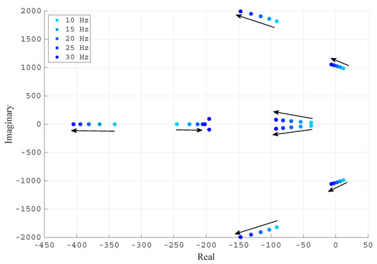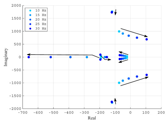The same analysis is repeated for the VSC rectifier operation. The VSC absorbs P = −1 pu and Q = 0 pu. Figure 9 shows the root locus plot for different PLL natural frequencies (10, 15, 20, 25 and 30 Hz) when the VSC is connected to a grid with an SCR of 3. Note that a pair of complex poles shifts from the positive plane to the negative plane when the PLL natural frequency increases, thereby stabilising the system. Hence, when the VSC operates as a rectifier (), a low PLL bandwidth may destabilise the system, in contrast to the behaviour observed in the inverter mode.