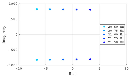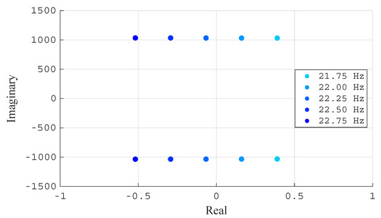 A zoomed-in view of the root locus is shown in Figure 7, indicating system instability when the PLL natural frequency exceeds 21 Hz. For that value, the pair of complex poles is , that is, highly undamped poles () with an oscillating frequency of 129.5 Hz.