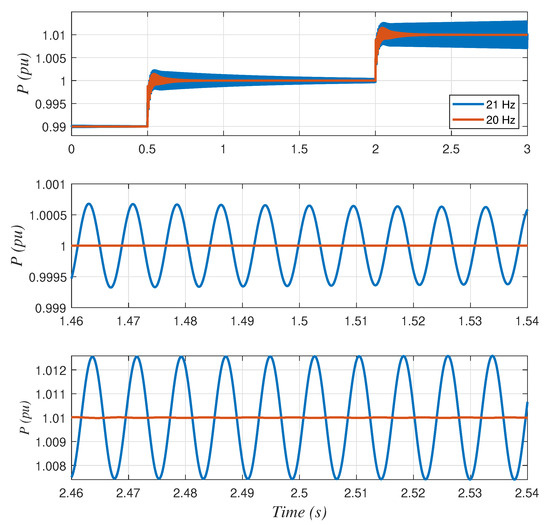 The same findings are obtained from the PSCAD model for two PLL designs with two different natural frequencies close to the stability limit, namely 20 and 21 Hz (Figure 8). The active power is changed from 0.99 to 1 pu at s, resulting in a very undamped but stable response for both PLL designs. When the power is increased to 1.01 pu at s, the system becomes unstable when the PLL natural frequency is 21 Hz with an oscillating frequency of 129.6 Hz. However, it is stable when the PLL natural frequency is 20 Hz. Therefore, both the small-signal model and PSCAD simulations consistently highlight the beneficial impact of a slower PLL on the system stability. Note that these simulations deliberately explore the limits of stability and are not intended to comply with interconnection standards (e.g., IEEE 1547 [29] or IEEE 2800 [30]). Therefore, neither of these controller designs would be acceptable in a real system. The goal here is to demonstrate the different behaviours of the rectifier and inverter that may make the system unstable rather than offer a fully compliant controller solution.
