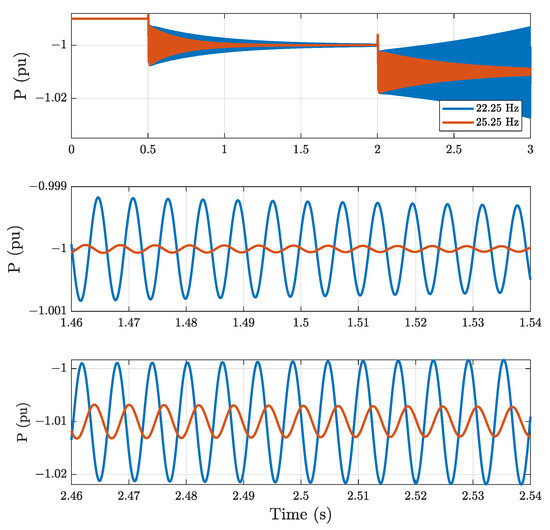 The same results are obtained from the PSCAD model for two PLL designs with two different natural frequencies close to the stability limit, namely 22.25 Hz and 25.25 Hz (Figure 11). The active power is changed from −0.99 to −1 pu at s, with both PLL designs being very undamped but stable. When the power is increased to −1.01 pu at s, the system becomes unstable when the PLL natural frequency is 22.25 Hz, with an oscillating frequency around 164 Hz. Conversely, it remains stable when the PLL natural frequency is 25.25 Hz. Therefore, both the small-signal model and PSCAD simulations consistently highlight the beneficial impact of a faster PLL on the system stability.
